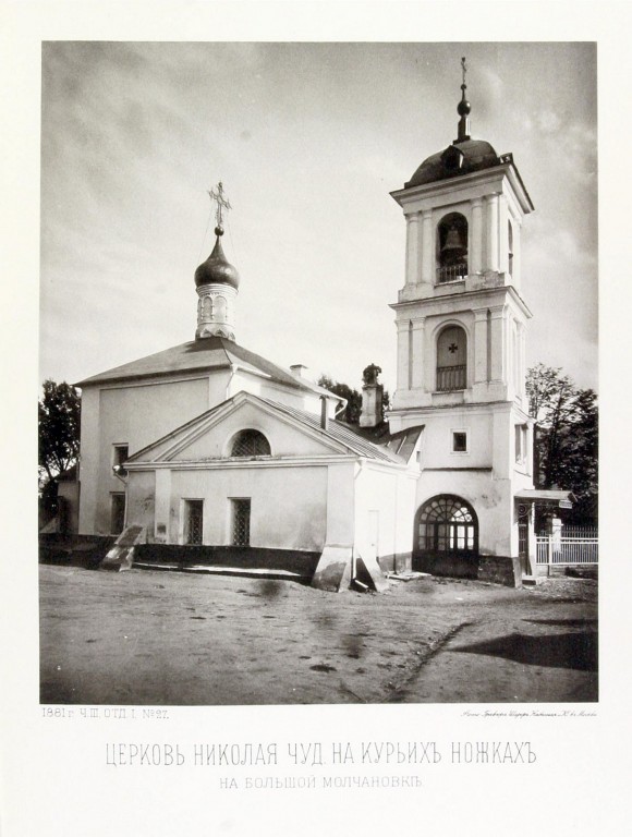 Церковь Николая Чудотворца на Курьих ножках известна деревянной еще с 1639 г. Храм располагался на углу Большой Молчановки, 26 и Большим Ржевским переулком, 1. В 1681 г. здесь появилась каменная одноглавая кубическая церковь. Перестроили из камня. В начале XIX века при церкви находилась трехъярусная колокольня и трапезная с приделом Екатерины Мученицы.