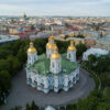 Венчает собор пять глав на барабанах различного диаметра, расставленных асимметрично, что создает впечатление воздушной легкости храма и устремленности вверх Главный вход – в широком углублении. В шестистолпном пятиаспидном сооружении с 8 приделами переплелись итальянские и византийские архитектурные традиции.