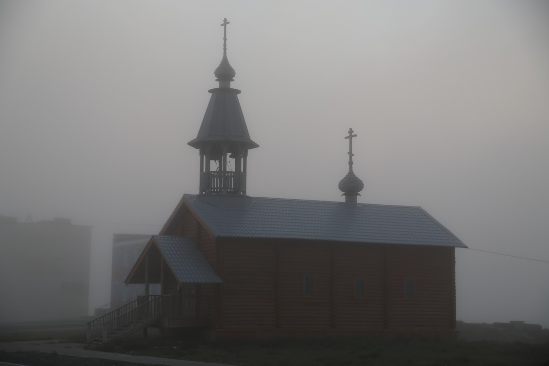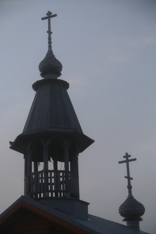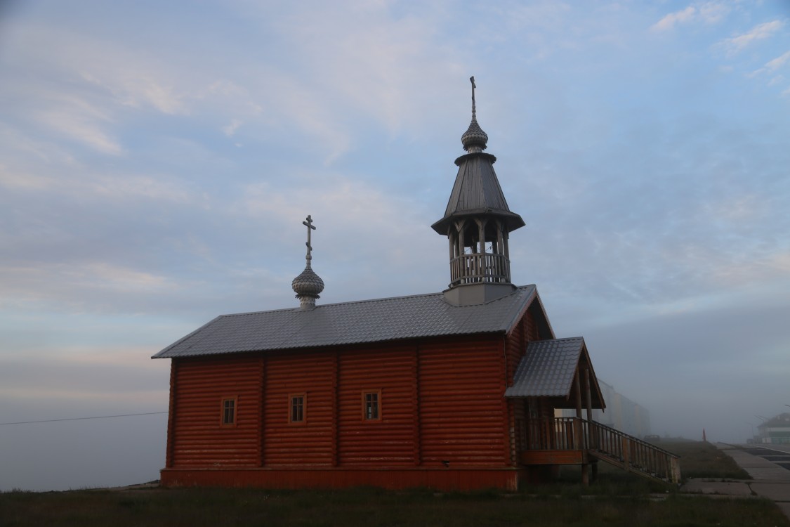 В самом конце коридора мы уперлись в три полуразрушенные перегородки – здесь когда-то располагался иконостас и алтарь. На одной из стен по центру — два букета красных бумажных цветов, а между ними простенькие иконки на картоне – Богоматерь, Спаситель, Святой Николай. Вероятно, приходил сюда кто-то из местных. И не беда, что разруха, – место, верно, намоленное… Мы постояли, помолчали и повернули на выход. Привернули в одно из разоренных помещений, по правую руку оно было. Там круто пол вздыбился, и неясно, то ли это вековечная сырость наконец одолела шпунт, то ли мерзлота подкралась замысловатым вывертом под фундамент. На улице еще раз обошли здание.- Досками сруб закрыли позднее, но, посмотрите, он уцелел. – Алексей Викторович остановился у западного торца постройки, как раз напротив, где вскрыта обшивка, подозвал меня. Выбеленные бревна выглядели крепкими, проложенный меж ними утеплитель (то ли мох, то ли пакля) тоже выцвел и будто совсем вжался, слился со срубом, но за минувший век его так и не вырвали, не выцепили злые арктические ветры. Наверное, святитель Николай оберегал-таки церковь-школу и сотворил с ее срубом очередное свое чудо.