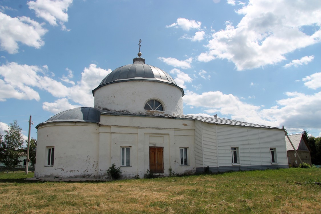 Первоначальный приходской деревянный храм во имя Иоанна Милостивого, выстроенный в 1797 г., сгорел в 1798 г. На его месте в 1814 г. был заложен каменный храм во имя Вознесения Господня. Строительство храма окончили только в 1825 г. Чуть раньше была выстроена трапезная, в которой находился алтарь во имя Иоанна Милостивого. В 1857 г. с левой стороны трапезной был установлен алтарь в честь святой великомученицы Екатерины Последнее богослужение в храме прошло в 1927 г. В здании полуразрушенной церкви в разные годы советской власти находились пекарня, склад для удобрений, тракторная мастерская, хранился цемент.