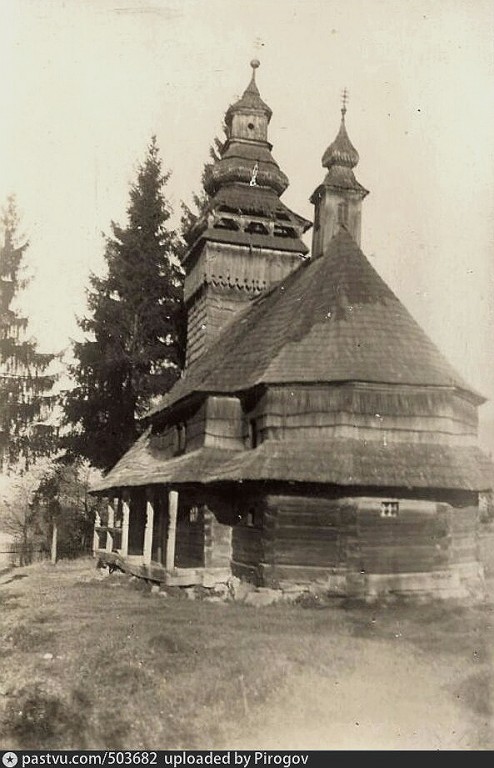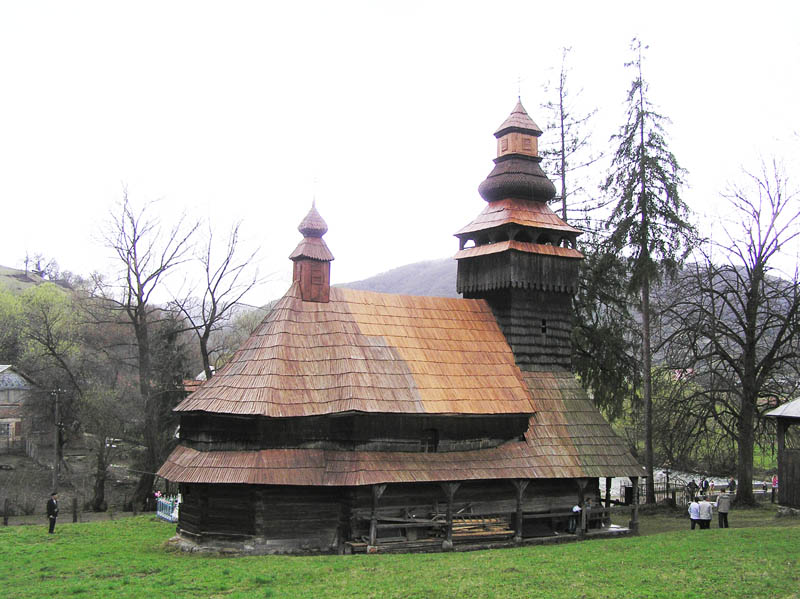 НИКОЛАЕВСКАЯ ЦЕРКОВЬ, XVII, 1794 г.Первоначально церковь была бойковского типа трехверхой. Перестройка в 1794 г. (надпись на обрамлении южных дверей) мастером М. Хими-чем (из с. Лючки) придала ей современный вид, характерный для большой группы закарпатских церквей конца XVIII в.