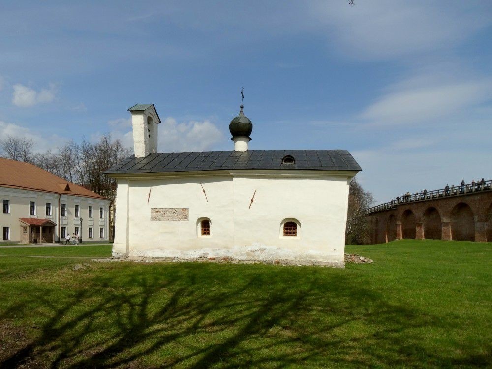 Небольшая церковь Андрея Стратилата возникла не ранее конца ХVII века или начала ХVIII века на разобранных развалинах древней Борисоглебской церкви, которую в 1167 году выстроил боярин Сотко Сытинич. В 1969 году внутри церкви Андрея Стратилата была раскопана хорошо сохранившаяся лестничная башня Борисоглебской церкви. Лестница в башне вела на полати, хоры, церкви.