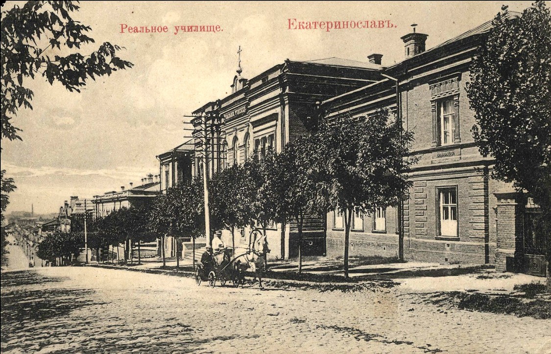 Реальные училища возникли в России в 1864 году. В Екатеринославе Городское реальное училище начало работать в 1875 году. Размещалось оно в тот период в частных домах Горовица и Штейна. В 1901 году Городское реальное училище стало 1-м реальным. При училище была домовая церковь Иоанна Богослова.