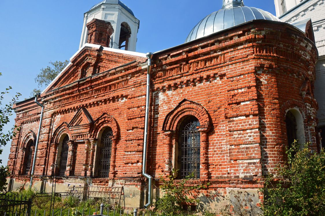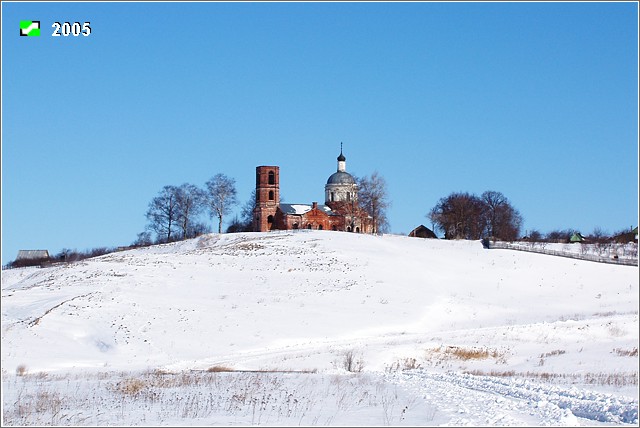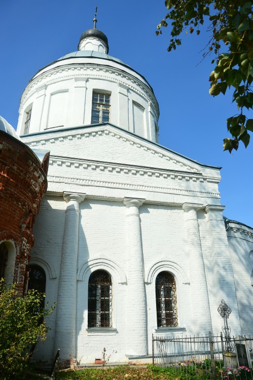В 1838 г. заложена была существующая ныне каменная церковь; освящена она в 1857 г. В 1875 году трапеза была расширена. Колокольня окончена постройкою в 1865г. Престолов в церкви два: в настоящей, холодной,—в честь Преображения Господня (над этим престолом устроена сень), в приделе—во имя Святителя Николая Чудотворца. Из святых икон пользуется особенным уважением у прихожан и почитается ими за чудотворную древняя икона Святителя Николая, перенесенная сюда из церкви, бывшей в деревне Масленке. В церковной библиотеке сохранилось евангелие, печатанное при патриархе Иосифе. Есть крест напрестольный серебряный с частицами св. мощей разных Угодников. На одном из потиров, имеющихся в церкви, есть надпись: «за упокой Климента, Ирины, Емельяна, Абрама от создания вдовы Любовской в церковь Рождества Богородицы». 2)*