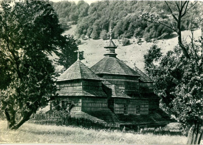 НИКОЛАЕВСКАЯ ЦЕРКОВЬ, 1655 г.Датируется по надписи на срубе. Деревянная, построена из еловых брусьев, покрыта гонтом. Трехсрубная, трехверхая. В плане все срубы близки к квадрату. Принадлежит к бойковскому типу с доминирующим центральным верхом и равновысо-кими верхами над притвором и восточной частью. Четверик центрального сруба в уровне верха стен над поддашием переходит в восьмерик, перекрытый восьмигранной шатровой крышей. Глухой восьмигранный фонарь покрыт шатровым завершением. Срубы восточной части и притвора перекрыты шатровыми четырехгранными верхами с одним заломом. Над бабинцем устроены эмпоры, над ними — каркасный ярус колокольни. Сооружение по периметру опоясывает поддашие на выпусках венцов сруба. Сохранилась деревянная резьба середины XVI11 в.