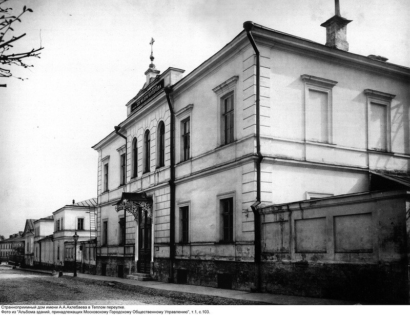По благочестивому обычаю давать приют странникам, в начале XIX века в России сердобольными гражданами стали строиться странноприимные дома, в которых можно было остановиться на небольшой срок. Отставной секунд-майор А.А. Ахлебаев пожертвовал земельный участок и капитал на строительство странноприимного дома, получившего по имени его основателя название Ахлебаевского. Целью его создания было «временное призрение бедных людей свободного состояния, пришедших в Москву для исправления необходимых потребностей или для снискания себе, трудами своими, пропитания, и не имеющих на первый раз ни приличного пристанища, ни достаточных средств к содержанию».