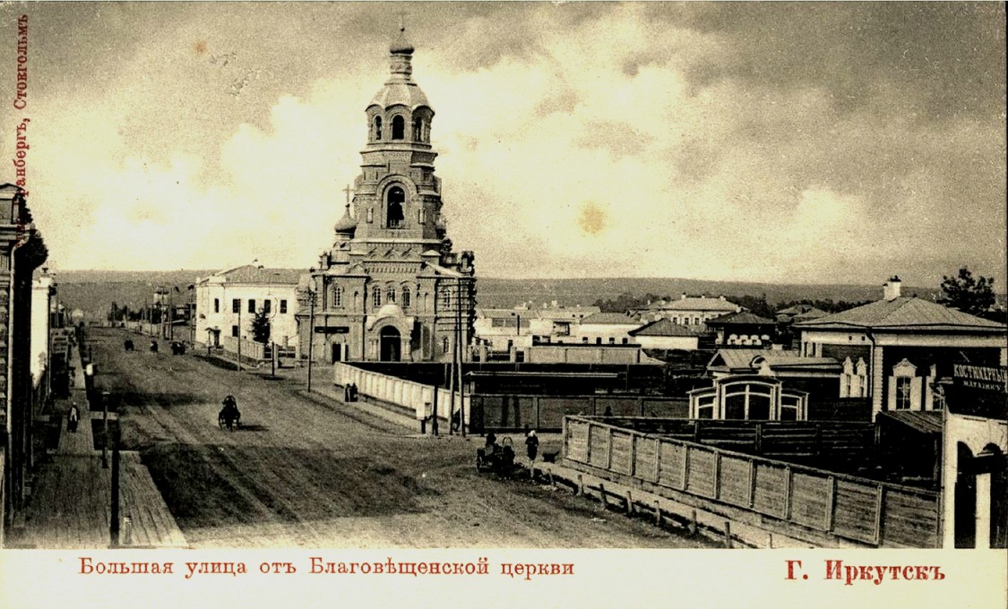 Благовещенская церковь строилась, в отличие от многих других иркутских храмов XVIII века, сразу в камне. Построена в стиле классицизма. Освящена в 1785 г. В пожаре 1879 пострадала настолько, что ее пришлось почти полностью перестраивать. Деньги на воссоздание храма пожертвованы богатыми прихожанами И.С. Котельниковым, С.И. Тельных и А.Ф. Дунаевым. Возведенную в русско-византийском стиле церковь освятили в 1891. После закрытия церкви на ее территории был устроен стадион, а в самом храме – спортивный зал. Находилась на углу Большой и Благовещенской улиц. Перед войной здесь построен большой жилой дом для железнодорожников.