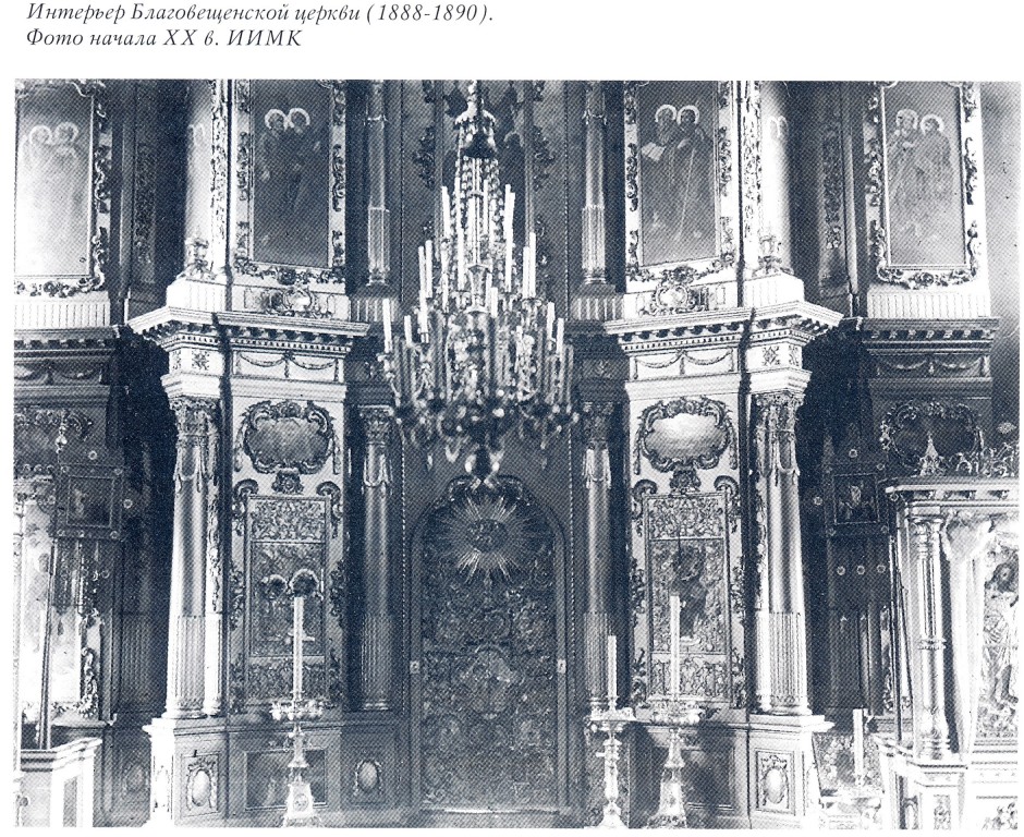 Первую каменную Благовещенскую церковь заложили в период управления епархией иркутским епископом Софронием – в 1758 г., на средства купца И. Бичевина. Были выложены фундаменты, но из-за пожара строительство остановилось. Возобновили его в 1785 г., на средства иркутского купца И. Баушева. Церковь имела четыре престола: главный во имя Благовещения Пресвятой Богородицы был освящен 29 октября 1804 г.; боковые – во имя Трех Святителей – 16 ноября 1785 г. (повторно 26 июля 1796 г.), великомучениц Варвары и Екатерины – 26 июля 1789 г. (1796 г.); последний холодный придел, устроенный под колокольней, освятили 4 (7?) августа 1821 г. во имя св. Сергия Радонежского и Макария Унженского Чудотворца. Каменная ограда была построена в 1852 г.