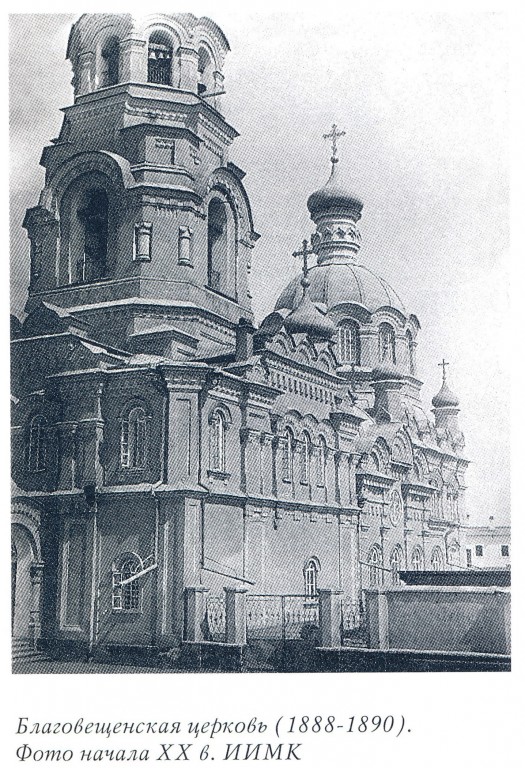 Церковь во имя Благовещения Пресвятой Богородицы (каменная), 1785–1804; 1888–1890. Построена на средства купца И. Баушева. Сильно пострадала в пожар 1879 г. и была основательно перестроена на средства И.С. Котельникова, С.И. Тельных и А.Ф. Дунаева. В 1821–1823 гг. здесь служил священником будущий епископ Камчатский, Курильский и Алеутский митрополит Московский и Коломенский Св. Иннокентий (И.Е. Попов-Вениаминов). Разобрана в 1931 г. Находилась на месте углу улиц Благовещенской и Большой (ул. Володарского и К. Маркса).