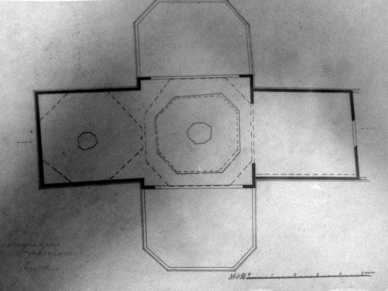 Как показывает чертеж, длина восьмерика центральной части в плане равна ширине алтаря, а ширина восьмерика равна половине диагонали плана центра; высота же – близка к половине длины восьмерика.
