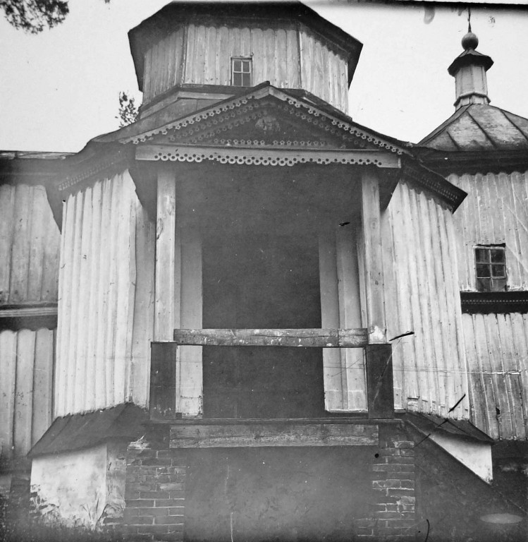 Снаружи церковь обшита встык. Ниже окон срубы стен обходит профилированный поясок-карниз, состоящий из двух полочек. Полочки испещрены зубчиками, напоминающими зубчики на ригелях в церкви в Ольшане. Подобные зубчики повторяются также на карнизах верха сруба стен и восьмерика.