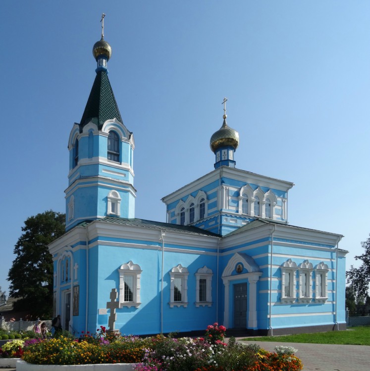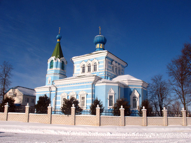 2) Памятник архитектуры псевдорусского стиля. Построена во 2-й половине XIX в. в д. Карма (Добрушский р-н). Крестообразная в плане, трехапсидная. Над центром небольшая головка на четверике. Доминантой объемно-пространственной композиции служит высокая двухъярусная колокольня, которая примыкает к притвору. Поверхность стен горизонтально рустованная. Оконные и дверные проемы декорированы наличниками с килеподобными завершениями фронтончика, арками с полуколоннами. Неф и трансепт храма перекрыты цилиндрическими сводами, притвор — крестным, апсиды — конхами. Церковь действует.