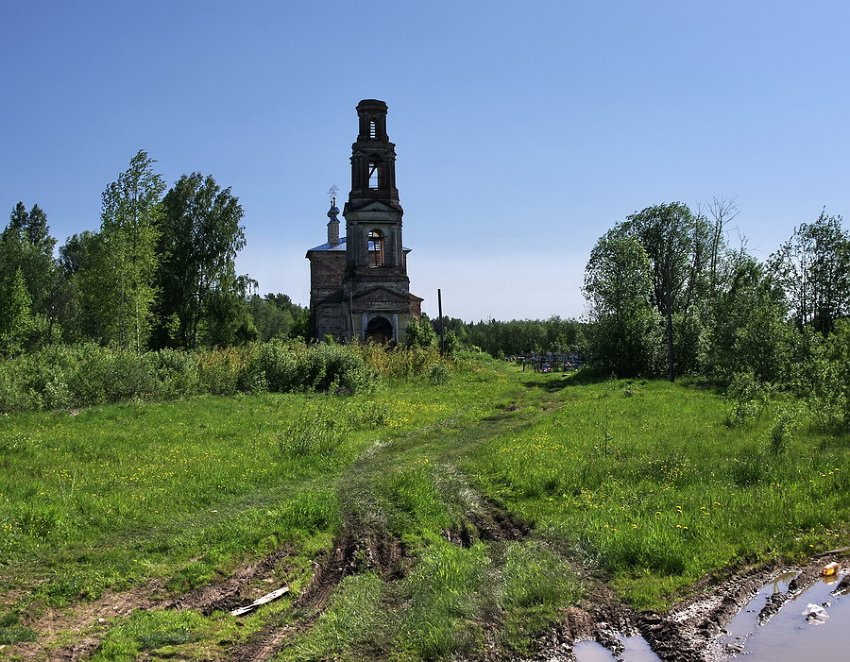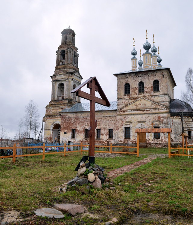 Церковь стоит в стороне от села на кладбище. Ее стройный двухъярусный четверик с четырехскатной кровлей, вытянутый в поперечном направлении, имеет типичное для солигаличских храмов венчание пятью тесно сдвинутыми главками на высоких цилиндрических барабанчиках (центральный световой). С востока к четверику примыкает полуциркульная низкая апсида, с запада — также пониженная и суженная трапезная, крытая на два ската. Самой богатой пластически частью композиции является четырехъярусная колокольня, состоящая из двух четвериков, восьмерика и завершающего цилиндра.Четверик храма с тремя осями проемов на боковых фасадах имеет ярко выраженное ярусное деление. Нижний ярус с арочным входом и фланкирующими его прямоугольными окнами отделен от верхнего упрощенным антаблементом и треугольным фронтоном, наложенным на широкий пояс — подобие двухчастного аттика. В верхнем ярусе помещены три арочных окна. В завершении фасадов — антаблемент с сухариками в карнизе. Все окна храма заключены в широкие гладкие рамочные наличники, в первом ярусе усложненные ступенчатой П-образной нишкой над проемом, а во втором — маленьким клинчатым замком. Декор апсиды и трапезной идентичен и ограничен рамочными наличниками с лежачими нишками над горизонтальными перемычками и трехчастным антаблементом. Нижний четверик колокольни с юга и запада прорезан крупными арочными проемами, западный фасад украшен четырехколонным тосканским портиком (фланговые колонны ныне утрачены), треугольный фронтон которого наложен на широкий аттик с лежачей филенкой; над входом был металлический зонт на ажурных кронштейнах. Арки звона во втором ярусе отмечены двухколонными портиками с фронтонами, в третьем сдвоенные колонны с фронтончиком декорируют узкие диагональные грани восьмерика, а в верхнем, цилиндрическом, парные колонны украшают простенки между арочными проемами и поддерживают тяжелый карниз в основании уплощенного купола.Храмовый четверик перекрыт четырехлотковым сводом со световым кольцом в шелыге и маленькими распалубками над верхними окнами; несколько выше окон помещен ряд голосников. Три арочных прохода ведут в алтарь, перекрытый конхой, трапезная завершена полулотковым сводом, а нижний ярус колокольни — коробовым. В северной стене колокольни устроена лестница к звону и миниатюрная палатка с коробовым сводом. На стенах храмового четверика и в алтаре сохранились остатки клеевой живописи 1-й пол. 19 в., позже прописанной маслом. Под верхними окнами проходит гризайльный карниз с модульонами, под ним — сцены страстного цикла в прямоугольных рамах, на западной стене композиции помещены двумя ярусами. Колорит живописи холодный, построенный на сочетании серо-синих и коричневых тонов.