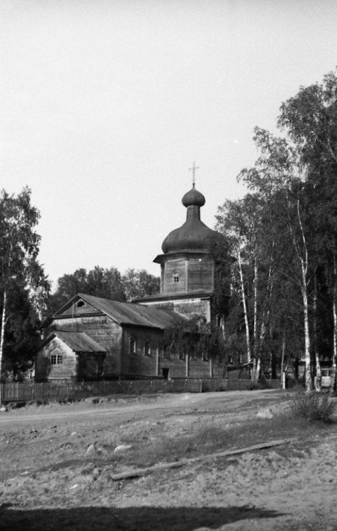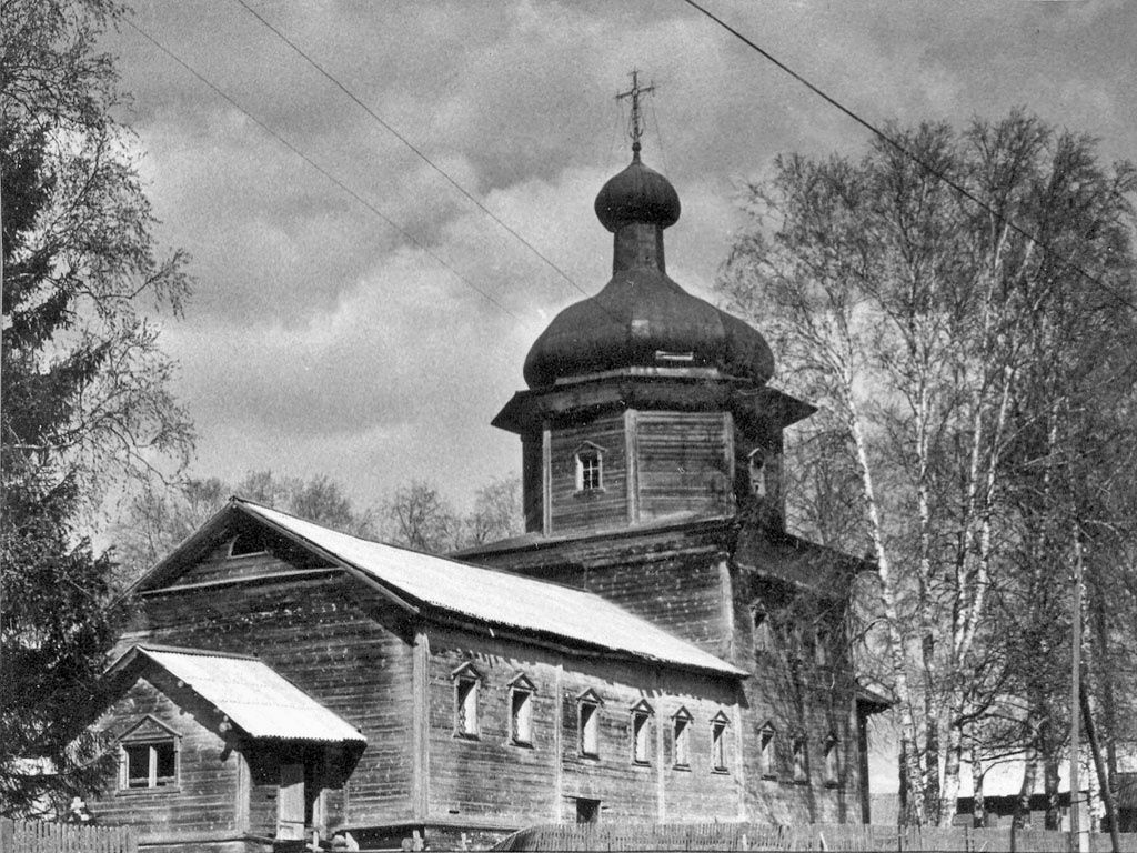 Первая — Воскресенская церковь — деревянная, одноэтажная, холодная, с теплым приделом — Успенским. Она строена еще в то время, когда существовала первоначальная деревянная Николаевская церковь. Главным деятелем по постройке ее и по украшению иконами и утварью был местный священник Антоний Петров Петропавловский. Постройкою она была начата в 1791 году и окончена к 1800 году, когда была освящена 24 июня протоиереем Вельского Троицкого собора Стефаном Левицким, по благословению и грамоте Епископа Вологодского Иринея, но уже по смерти епископа.