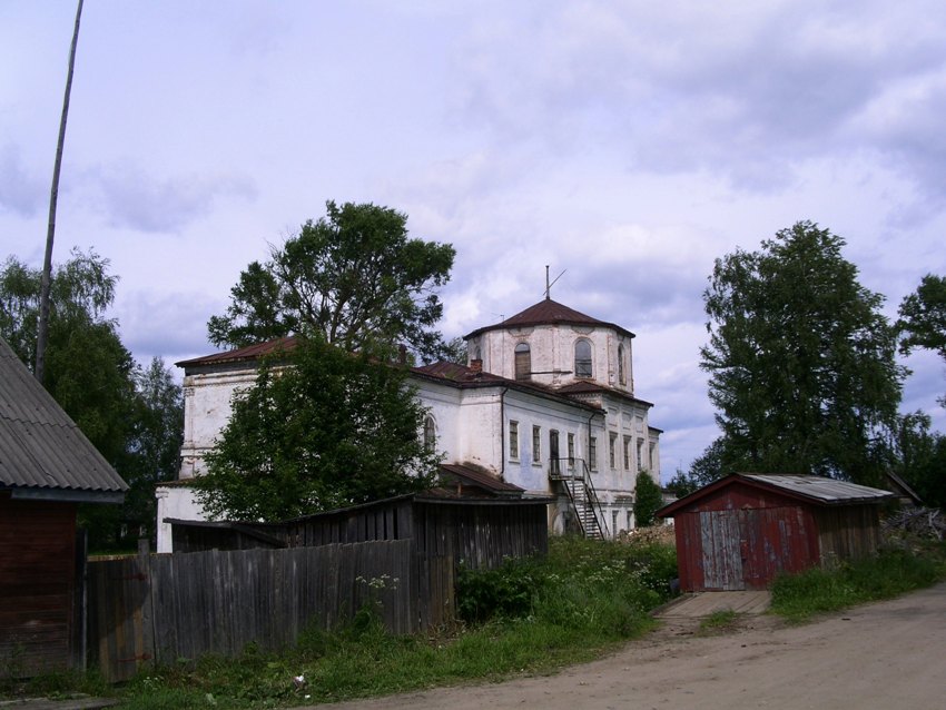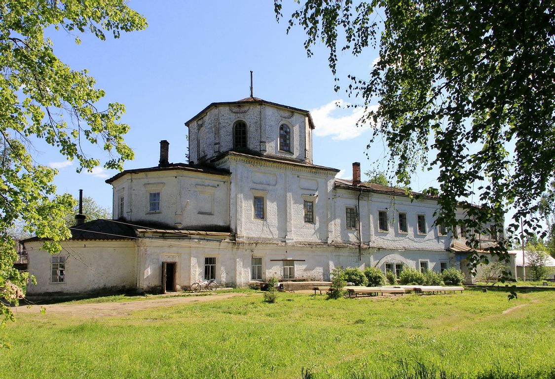 Кирпичная двухэтажная церковь, построенная в 1732 г. на средства купца Бобровского. Здание типа восьмерик на четверике с трапезной и колокольней под шпилем. Внизу Спасский престол, вверху Троицкий. Закрыта не позже 1930-х г.г., колокольня и главка с куполом восьмерика сломаны. Поддерживается в порядке, занята Домом культуры.