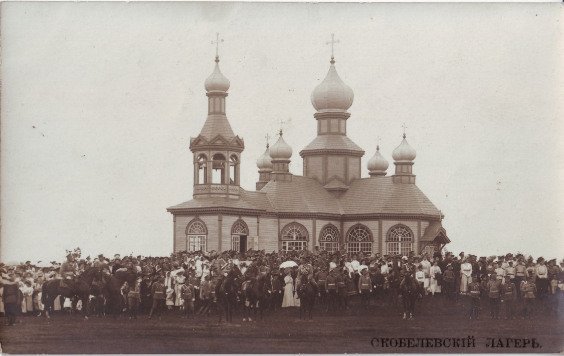 В 1900 году в Скобелевском лагере построили большой деревянный храм в честь Преображения Господня — крестообразный в плане, с пятью куполами и пристроенной колокольней, также увенчанной куполом… При генерале Новосильцеве в Скобелевском лагере начала действовать и новая церковь. Старый храм к тому времени от ветхости покосился, его гонтовая крыша прохудилась настолько, что не защищала от дождя. И снова–таки — больший храм нужен был не только военным, прибывающим на сборы, но и крестьянам близлежащих деревень. В 1913-1914 годах новый храм — бревенчатый, на каменном фундаменте, под железной крышей — построили. Однако с началом Первой мировой войны IV армейский корпус снова отправился на театр военных действий.