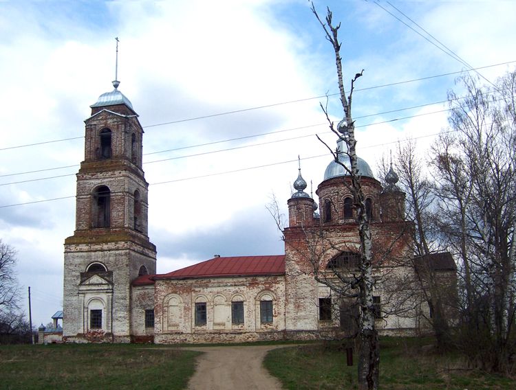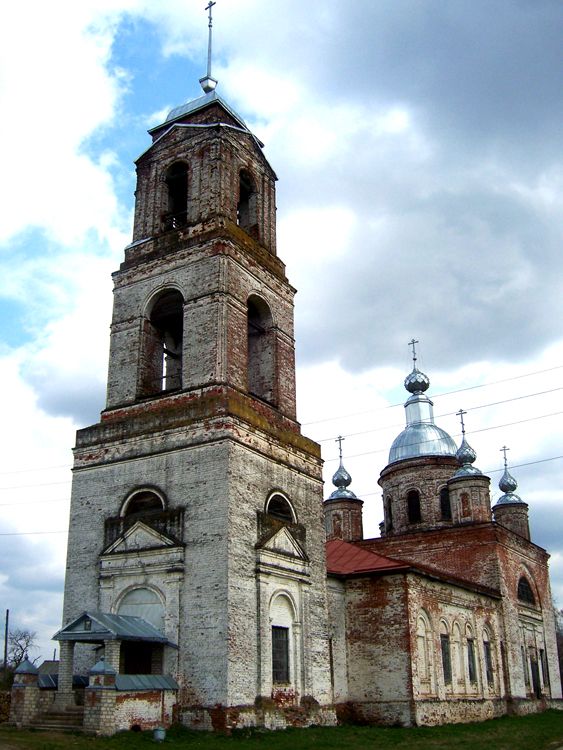 Стоит в центральной части села, на возвышенном месте, окружена деревьями. Построена из кирпича в 1845 г. в упрощенных формах позднего классицизма, характерных для рядового сельского строительства этого времени. Композиция основного объема — двусветного четырехстолпного четверика, завершенного пятиглавием, — по своему характеру скорее барочная. Крупный центральный световой барабан контрастирует с глухими маленькими барабанами глав, отнесенными на углы четверика. Двухъярусный аттик и удлиненная купольная кровля центрального барабана с декоративной главкой в завершении усиливают выразительность силуэта. К четверику примыкают пониженные объемы: поперечно вытянутый прямоугольный алтарь и обширная трапезная; с ней переходом соединена трехъярусная колокольня, завершенная шпилем. Плоские пилястровые портики украшают боковые фасады четверика, восточную стену алтаря, грани нижнего и верхнего ярусов колокольни. На четверике они включены в традиционную для позднего классицизма композицию с крупной арочной нишей, объединяющей прямоугольные проемы первого света и большое полукруглое окно второго. В обрамлении арочных окон и ниш барабанов и прямоугольных окон остальных объемов (частью ложных) использованы различные варианты наличников с профилированными архивольтами. Декор здания отличает также развитая система карнизов. В интерьере широко расставленные столбы-пилоны служат опорой барабану купола, коротким рукавам средокрестья и перекрытиям небольших угловых компартиментов. В алтаре свод коробовый, в трапезной — лотковый с распалубками. Пол выстлан чугунными плитами. В основном объеме и трапезной частично сохранилась масляная живопись.