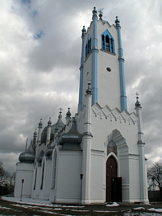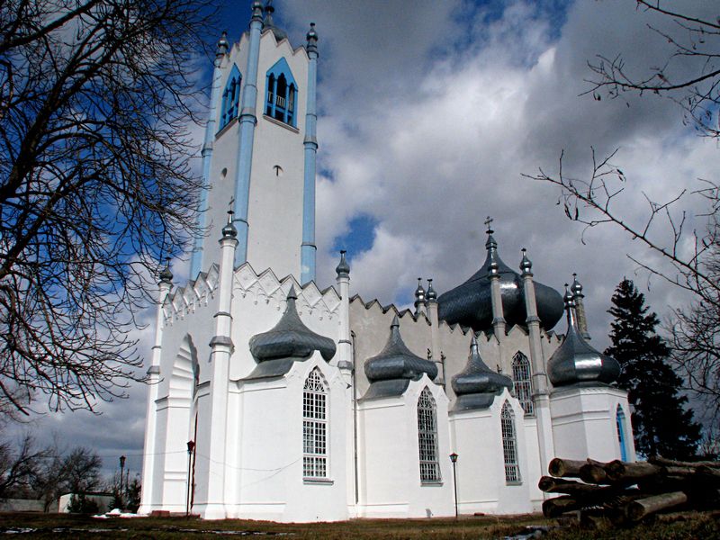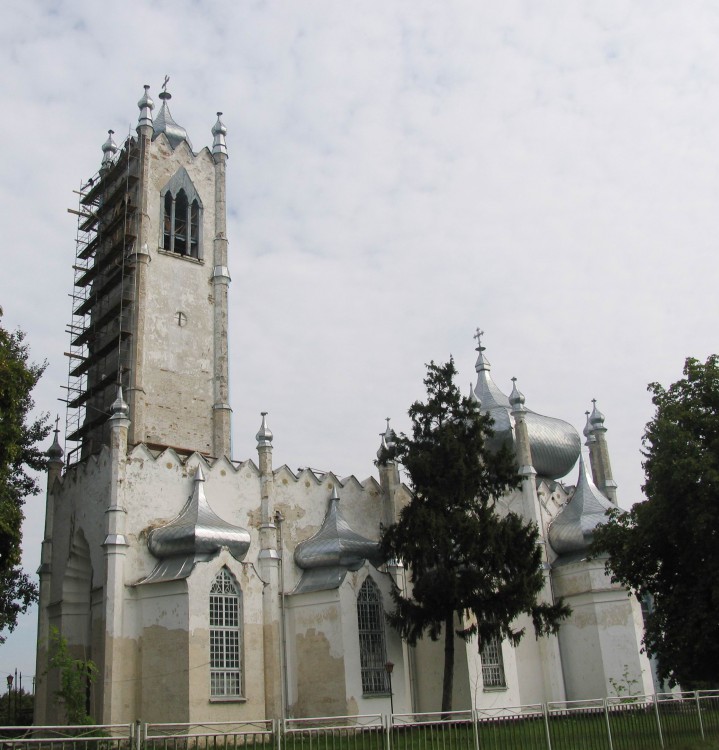 ПРЕОБРАЖЕНСКАЯ ЦЕРКОВЬ, 1830—1840 гг. Построена по проекту архит. Торичелли в стиле романтизма с использованием элементов тюдоровской готики. Кирпичная, базиликального типа, с трансептом и величественной башней-колокольней над притвором. Габариты памятника — 44.0Х20.0Х39.9 м. К широким сторонам восьмигранного в плане средокрестия примыкают с трех сторон граненые капеллы, такие же капеллы меньших размеров расположены с северной и южной сторон нефа. В декоративном оформлении сооружения фантастически переплелись орнаментальные «готические» формы с мотивами восточного искусства. Фасады завершены зубчатыми парапетами; капеллы, средокрестие и башня-колокольня увенчаны вычурными луковичными главами, стройные декоративные фиалы с луковичными главками отмечают все углы сооружения и участки стен между капеллами. Перемычки оконных и дверных проемов решены в виде стрельчатых многолопастных арок, а в звонном ярусе колокольни устроены трёхпролетные арочные проемы готической формы. В интерьере выявлена четкая объёмно-пространственная структура сооружения. Полуциркульные капеллы перекрыты конхами, средокрестье — плоским потолком, неф — двускатным перекрытием с декоративными висячими стропилами с фигурной аркой на консолях. Аскетический образ интерьера контрастирует с причудливыми формами фасадов. Памятник относится к произведениям архитектуры романтического периода, в который привнесены черты наступившей эпохи эклектизма, что дало столь фантастическое соединение стилевых особенностей. Аналогией ему служит собор в Ялте, построенный архит. К. И. Эшлиманом по проекту архит. Торичелли.Из книги «Памятники градостроительства и архитектуры Украинской ССР», том 4, стр. 254-255, издательство «Будивэльнык», 1983-1986 год