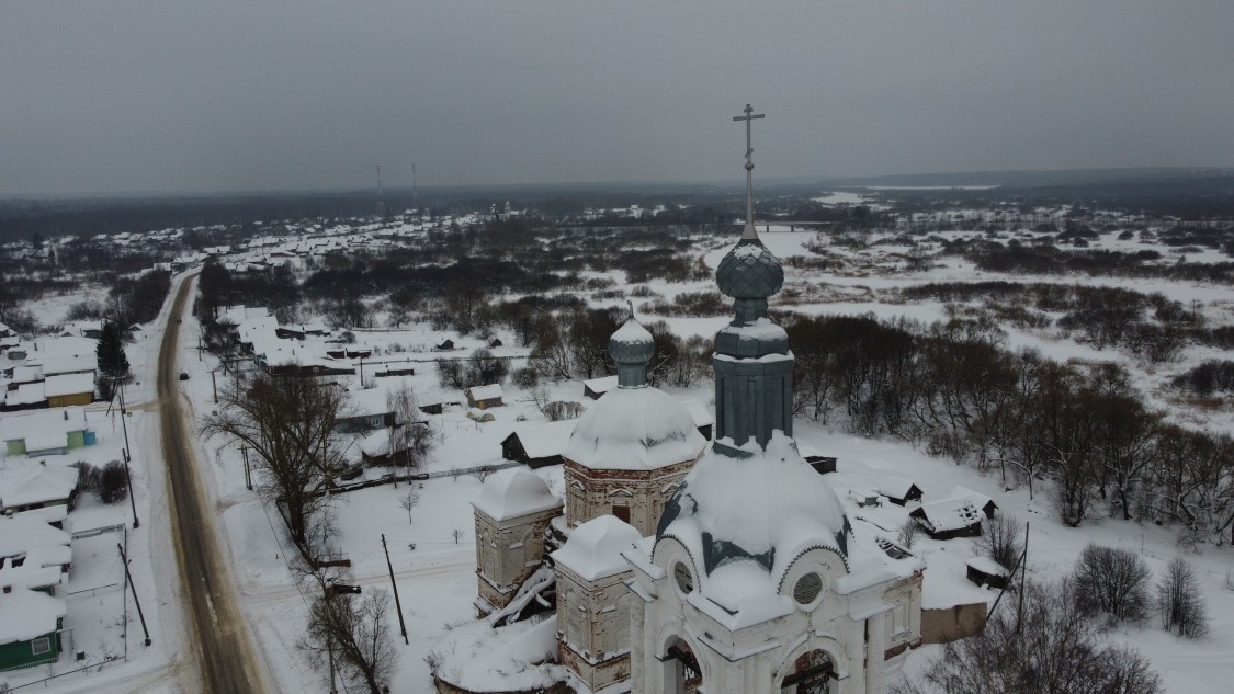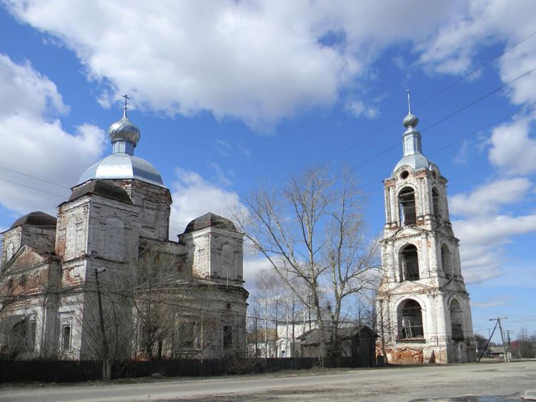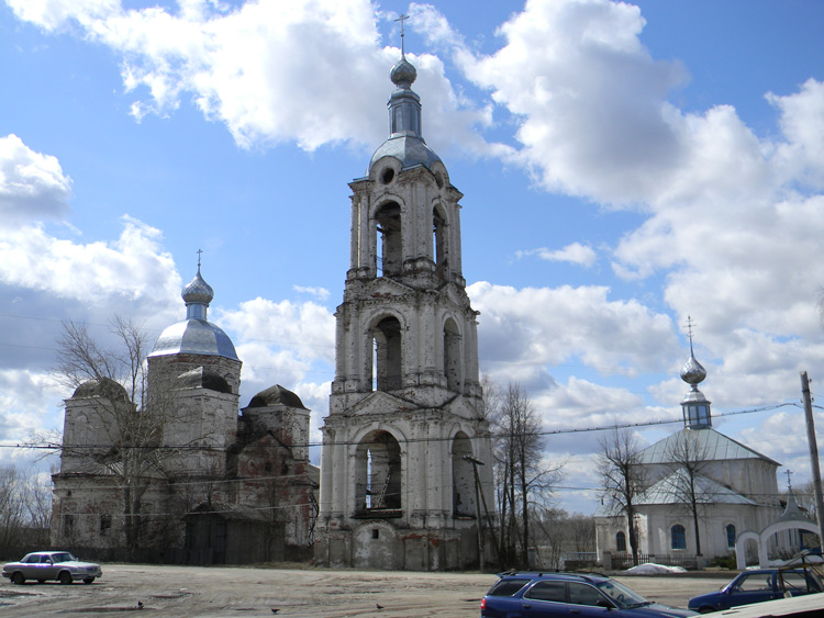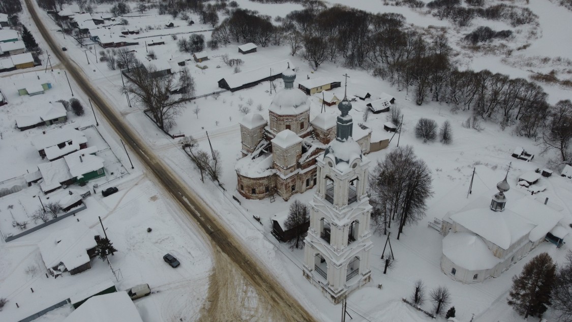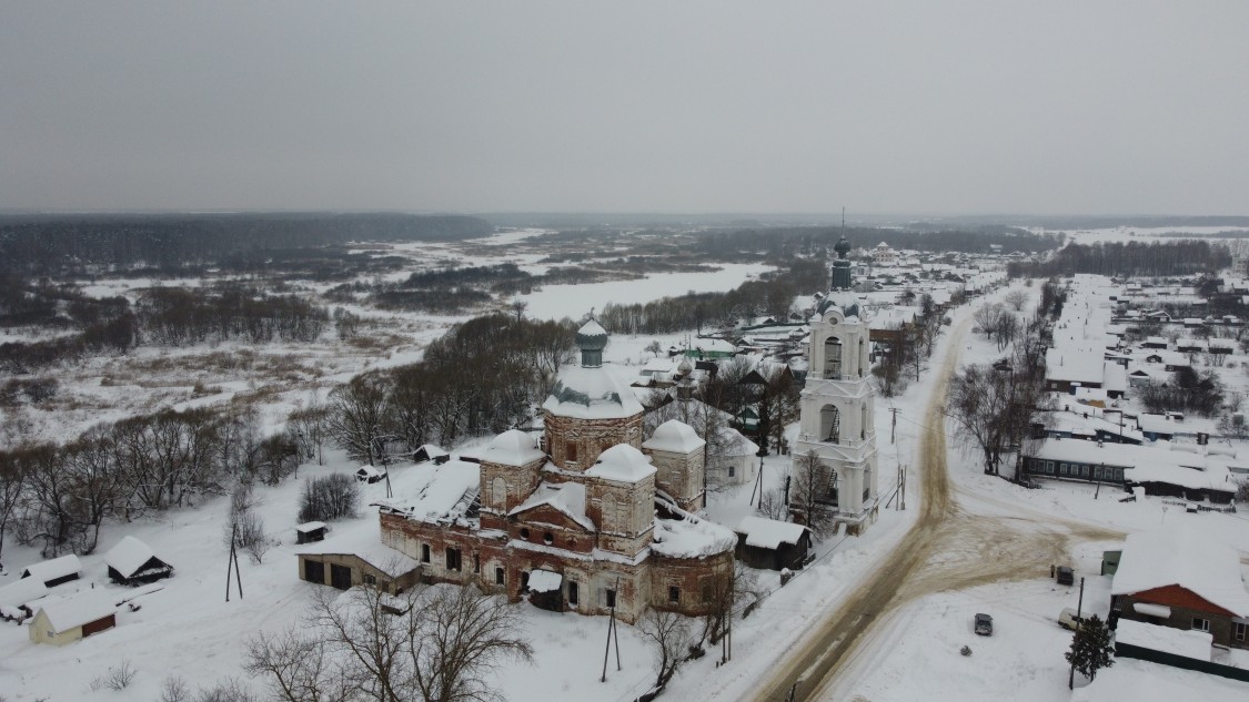 ХРАМОВЫЙ КОМПЛЕКС: ЦЕРКВИ КАЗАНСКАЯ И НИКОЛАЯ ЧУДОТВОРЦА, кон. 18-нач. 19 в. Расположен на небольшом повышении рельефа, представляет собой наиболее выразительный элемент застройки села. Главенствующую роль в композиции играет расположенная в южной части пятиглавая Казанская церковь (1795), напоминающая своими размерами городской собор. Севернее и несколько ближе к реке поставлена одноглавая и значительно меньшая теплая церковь Николая (1817). С восточной стороны, почти по оси комплекса и подводящей к площади главной улицы в нач. 19 в. построена трехъярусная колокольня. Все сооружения кирпичные и побеленные. Различные по стилистике, они составляют единую и выразительную композицию. Церковь Казанская выстроена в лицевой кладке и является памятником зрелого классицизма, сохранившим отдельные черты барокко в объемной композиции. Имела пять приделов, в одном из которых долгое время хранилась икона Корсунской Богоматери, которую князь Д.М. Пожарский брал с собой в поход. Крытые крыльца трапезной и боковых фасадов разобраны в 20 в. Традиционное для приходской церкви сочетание основной храмовой части с трапезной воспринимается здесь необычно. Вполне самостоятельный основной объем с двусветными ризалитами посредине боковых фасадов и широкой полукруглой апсидой представляет собой один из вариантов четырехстолпного собора. Мощный световой восьмерик главного купола приподнят над центральной частью аттиком-трибуном; к последнему примыкают башнеобразные четырехгранные барабаны над углами четверика.