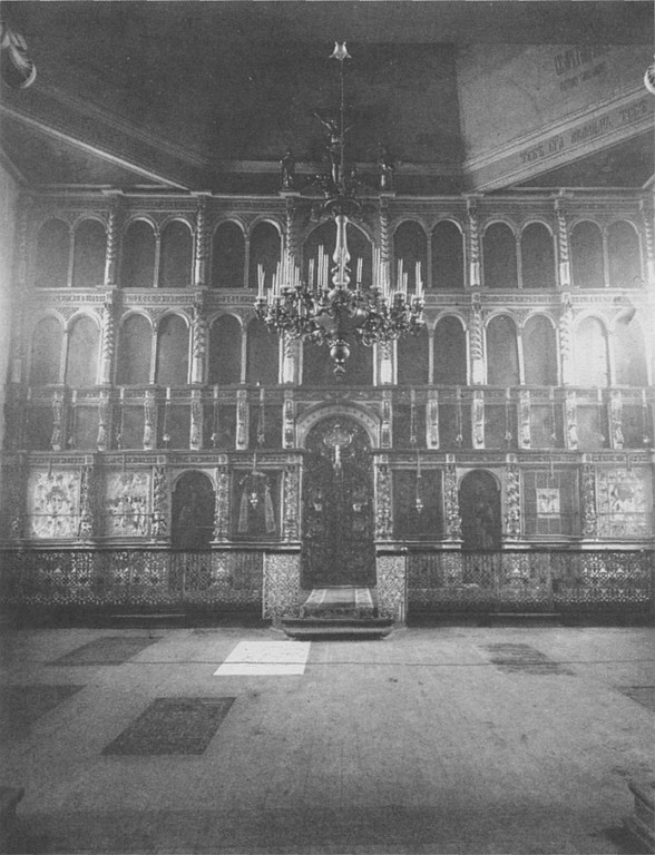 Роспись главного купола (деревянного) и горизонтальных треугольников, «парусов» хорошая, масляная, XIX в., должна быть сохранена, хотя не мешало бы сделать под нею разведки. Окраска стен клеевою краскою позднейшая, неприятная, должна быть счищена к заменена теплым серым тоном без всяких рамочек, по образцу проглядывающего кое-где под существующей окраскою. В полу церкви несколько чугунных и каменных надгробных плит с датами конца XVIII в., на стенах отличные фарфоровые в медных рамах доски XVIII в. с надписями о погребенных здесь. О. настоятель желал бы закрыть линолеумом надгробия по тем соображениям, что во время венчаний, при радостном настроении, вид надгробий действует неприятно; я с этим не согласен. При церкви есть часовенка начала XIX в., в ней сохранился весь очень красивый внутренний наряд».