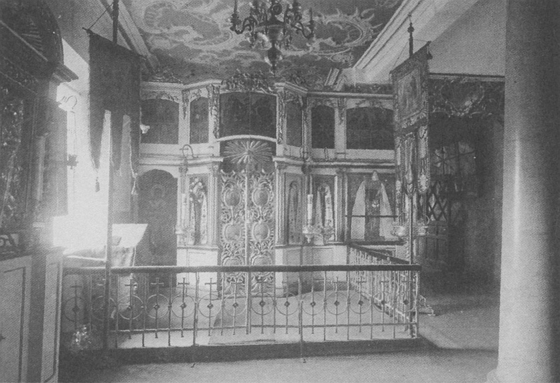 Иконостас главного алтаря — в 4 яруса. В нижнем ярусе помещены иконы: Преображения Господня, Богородицы, архидиаконов Филиппа и Лаврентия, Святителя Николая и образ „Неопалимой Купины»; во 2-м ярусе — дванадесятые праздники, в 3-м апостолы и среди них Деисус, в 4-м — пророки и среди них «Коронование Божией Матери». На верху распятие, с Богородицею и Иоанном Богословом. Иконостас возобновлен в 1856 г. Солея возвышается на 2 ступени, обведена железною решеткою и имеет ширины около 2 аршин. Иконостасы в приделах несколько меньше. Антиминс главного алтаря освящен митрополитом Григорием 1858 г. июня 1 дня; антиминс Никольского придела освящен митрополитом Амвросием 1812 г. марта 2 дня, антиминс Ильинского придела холщевой, освящен архиепископом Сильвестром 1775 г. января 29 дня.