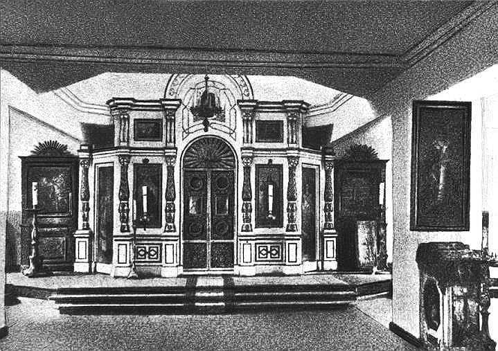 Первая в киновии небольшая деревянная церковь освящена 29 января 1821 г. В 1861 г., в связи с ветхостью, заменена другим деревянным одноглавым зданием простой архитектуры, возведённым чуть поодаль по проекту К.И. Брандта. В 1888 г. отремонтирована. Закрыта по решению Володарского райсовета от 20 февраля 1931 г., предполагалась к сносу, но летом того же года была переделана под общежитие. Зимой 1942 г. церковь разобрана на дрова.