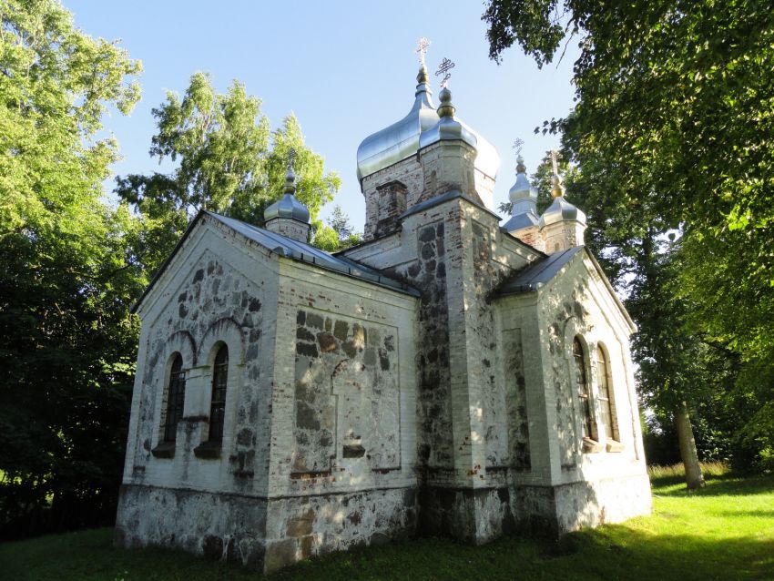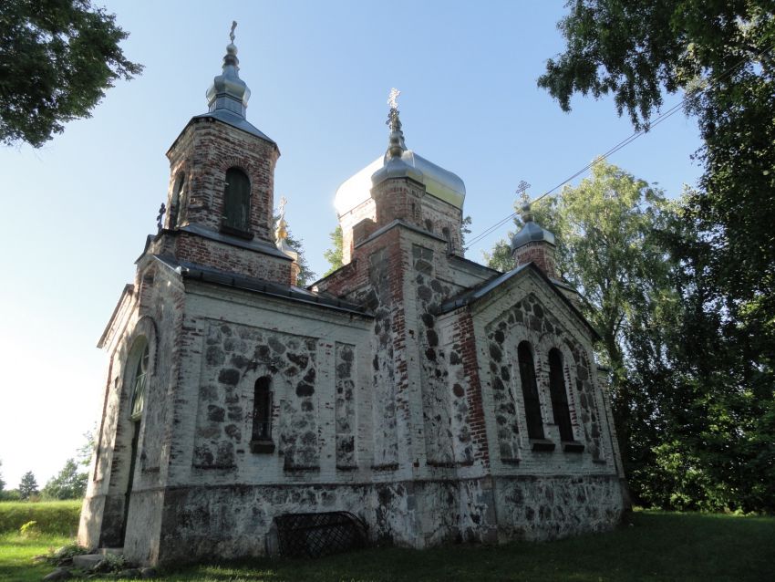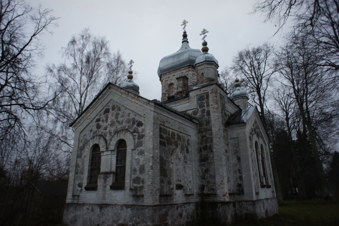 Трехчастный храм с колокольней над притвором завершен луковичным пятиглавием, колокольня – луковичной главкой. Он имеет план в виде квадрата (в интерьере – со «скошенными углами») с симметрично пристроенными с запада и востока прямоугольными в плане объёмами притвора и алтаря. Характерна кладка основного массива стен из булыжного камня. Фасады оформлены полуциркульными окнами. По материалам Латвийского и Эстонского исторических архивов, в качестве подрядчика при строительстве выступил отставной коллежский регистратор М. Андреев; малярные и штукатурные работы в 1874-1875 гг. вел дерптский мещанин Самуил Епифанов Соловьев.
