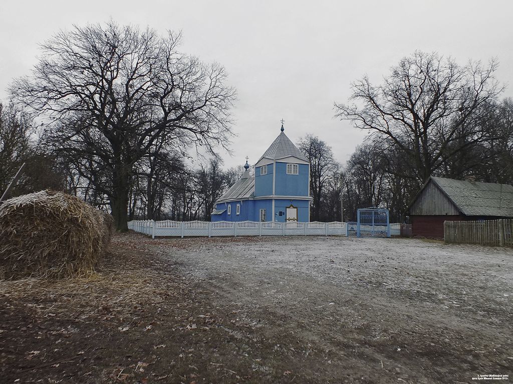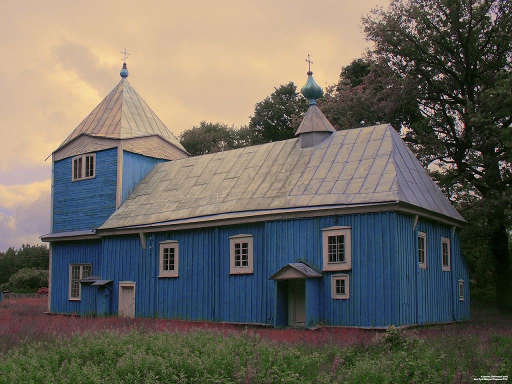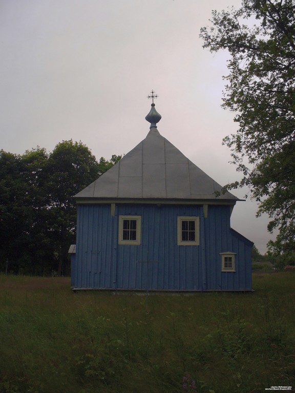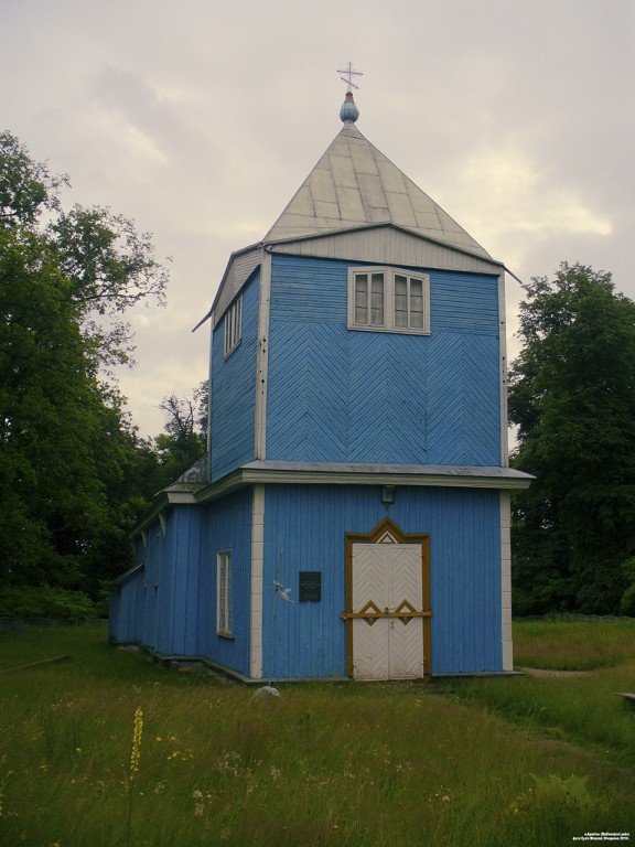 Здешнюю Покровскую церковь как униатскую заложили в ХVIII веке (в 1761 году освящена), а во второй половине ХIХ века существенно отремонтировали и пристроили массивную колокольню, которая своим несоразмерным объёмом практически закрыла небольшой храм прямоугольной конструкции с боковой ризницей при алтаре. Основной объём в плане имеет форму вытянутого прямоугольника с пристроенной к нему двухъярусной колокольней. Объёмно-пространственная композиция основана на контрасте низкого продолговатого сруба и высокой колокольни. Гладкая балка карниза, поддерживаемая кронштейнами, соединяет сруб с первым ярусом колокольни. Стены фасадов облицованы деревянными досками и выкрашены в синий цвет. Окна большие, прямоугольной формы. В центре крыши над небольшим шатром возвышается маковка в виде луковичной главки с крестом.