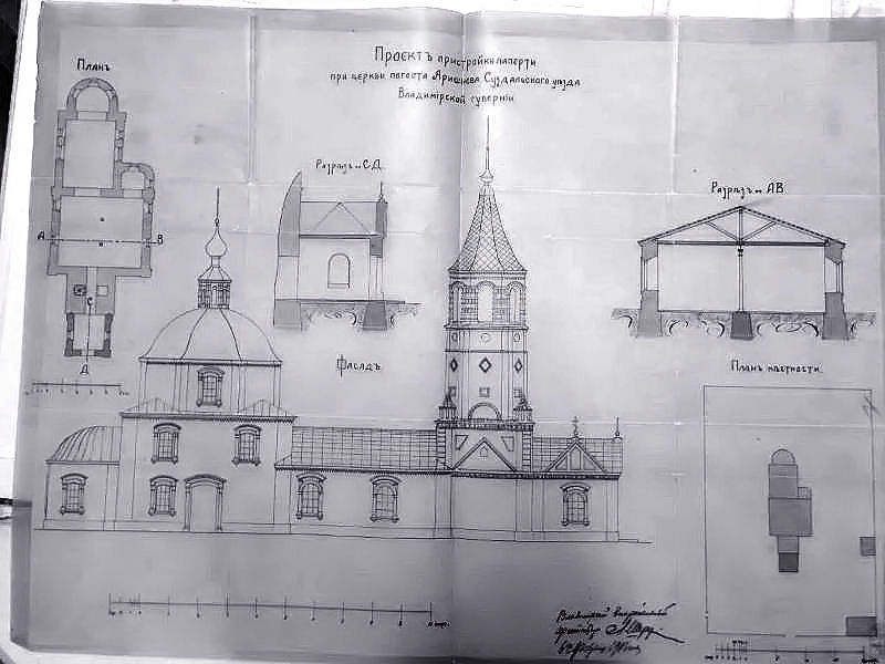 Чертёж 1913 года хорошо прорисован и позволяет судить об облике храма, размерах, его последней пристройке паперти. В 20 веке церковь была сломана.