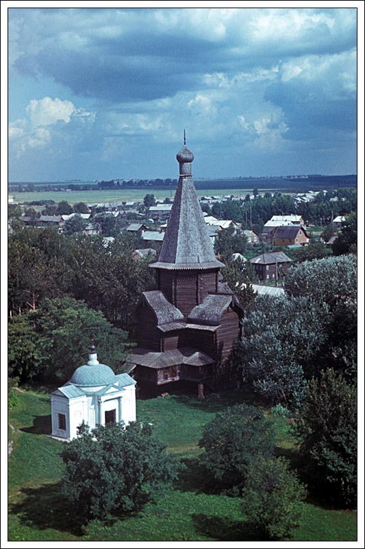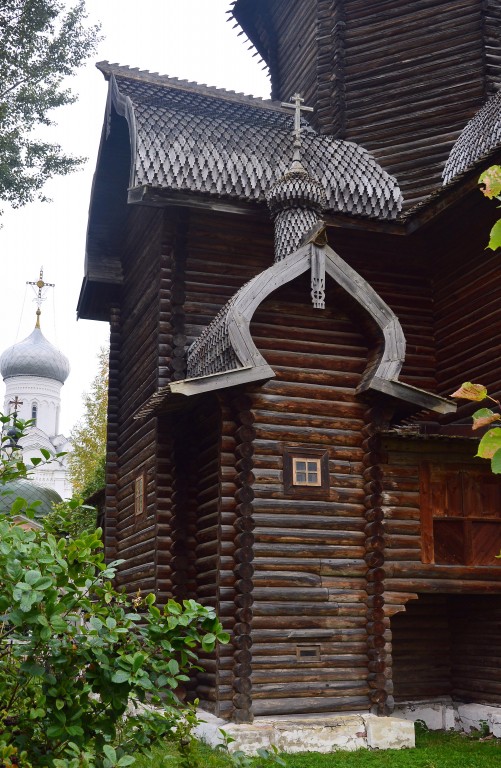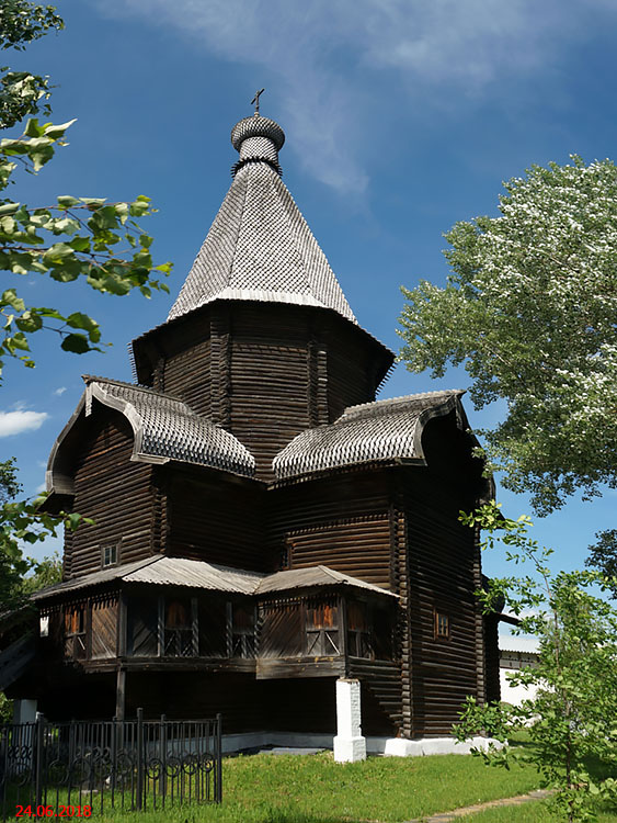 В северной архитектуре наиболее ранний известный нам случай его использования – редкой красоты храм во имя Рождества Пресвятой Богородицы из села Передки (между 1531 и 1539 год). В музей деревянного зодчества «Витославлицы» Великого Новгорода его перевезли из Передского Рождественского монастыря. Центральный объем храма окружен четырьмя прирубами, крытыми на два ската. Шатер и малые шатры северного и южного прирубов образуют живописную композицию, которую дополняет крытая галерея на консольных выступах-помочах, охватывающая храм с трех сторон. С запада к ней примыкает крыльцо с двумя всходами на срубе. Датировка храма основана на косвенных данных и, вполне вероятно, что она относится только к центральному объему. Есть данные, позволяющие отнести сооружение боковых приделов к XVII столетию. Эту версию подтверждает и сама композиция храма, так как первые многошатровые церкви в России, судя по данным Писцовых книг, появляются не ранее 1619-1630-х годов (Никольский храм на Шунгском погосте и Георгиевская церковь в остроге Толвуйского погоста). Следует отметить, что эти храмы не были многопридельными, как храм Рождества Пресвятой Богородицы [5]. В 1699 году церковь «перебрали», и именно тогда ее композицию дополнили боковые приделы, шатры, крыльцо и галерея. Во время реставрации, проведенной в 1968-1971 годы, ей возвратили облик конца XVII века.