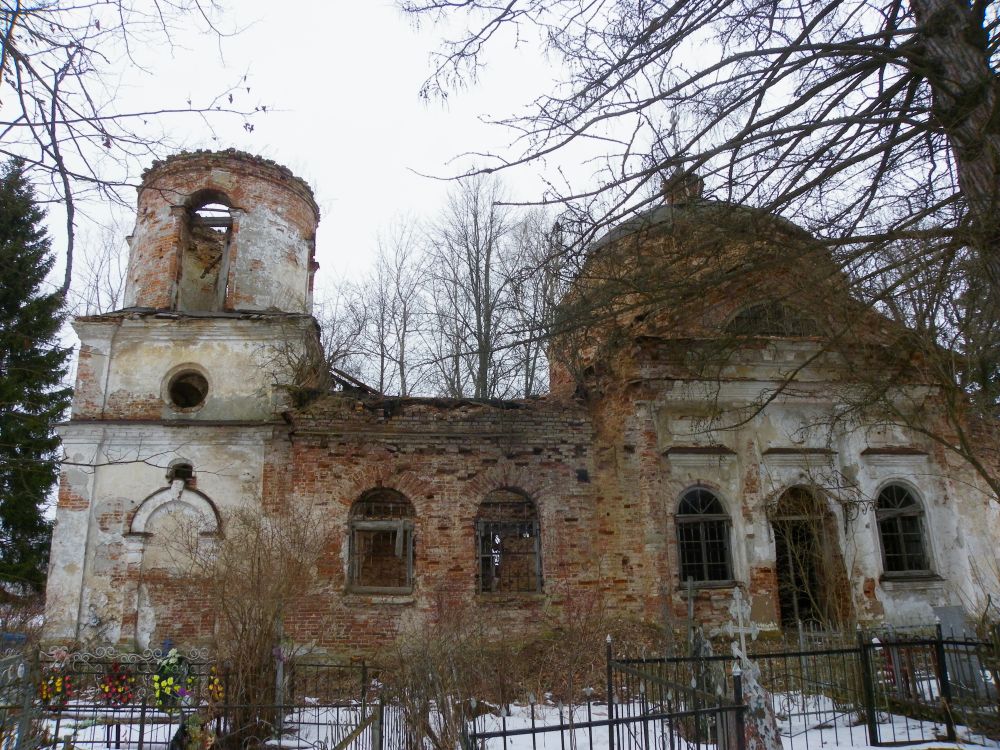 Вместо этой, за ветхостью разрушенной церкви и построен нынешний храм во имя Успения Пресвятой Богородицы; антиминс освящен епископом Нафанаилом и подписан митрополитом Антонием. Причт составляют: священник, дьячок и пономарь. Причт по штатам принадлежит к 5 классу и получает 310 руб. сер. с вычетом 6 руб. 20 коп. пошлины. Церковной земли 69 дес. 1793 квадр. саж. Из них пахотной 39 дес. 2092 квадр. саж., сенокосной 3 дес. 100 саж., под усадьбами и огородами 2 дес. 2040 квадр. саж.; под болотом, рекою Лугою и дорогами 23 дес. 1901 кв, саж.; сенокос находится в 5 верстах от церкви.