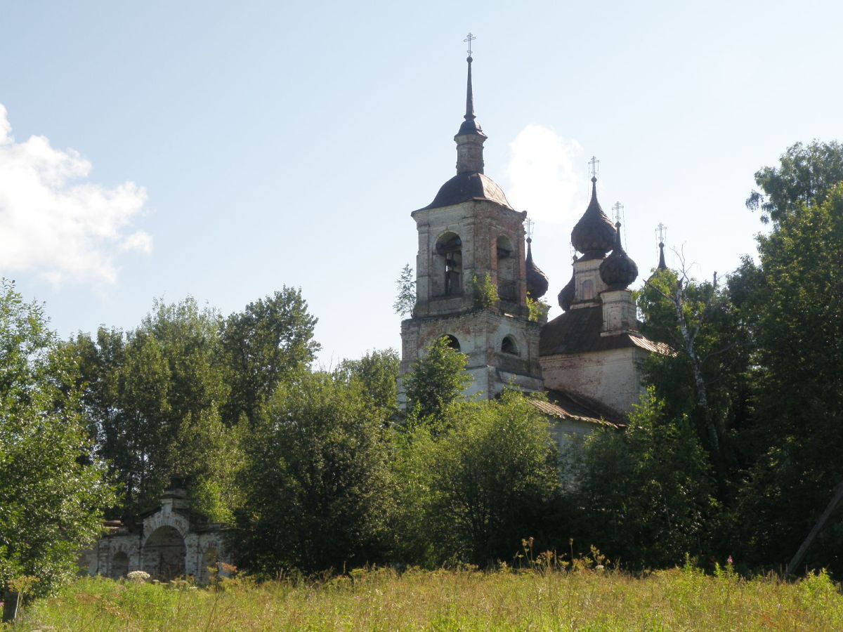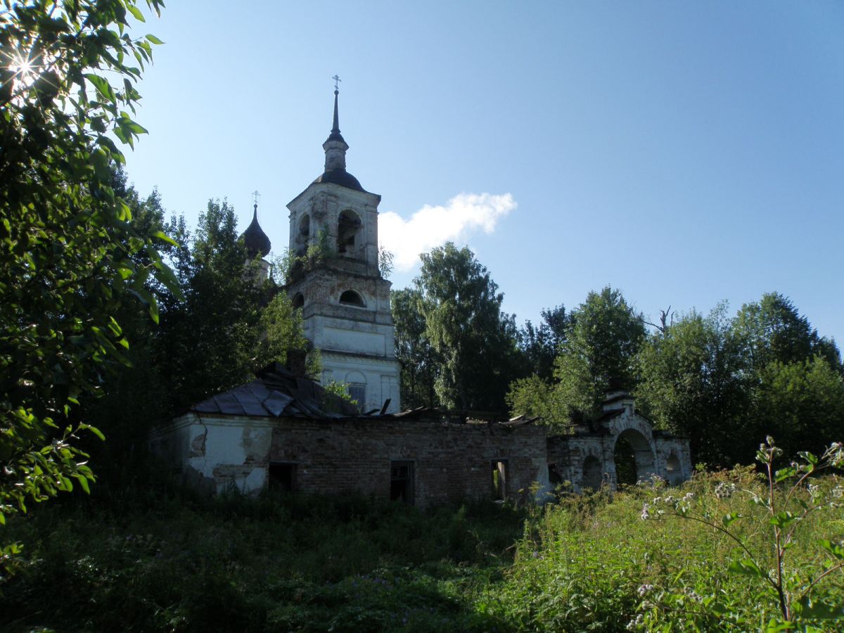 Зданием каменная (двух-этажная), с такою же колокольнею, постр. в 1823 г. тщанием прихожан. Ограда каменная, кладбище в церковной ограде. Престолов 5: а) вверху — Обновления храма Воскресения Христова, б) святит. Николая Чуд. и в) св. мчч. Флора и Лавра, г) внизу — Смоленской иконы Божией Матери и д) св. прор. Илии. Расстояние от Костромы 170 в., от Чухломы 53 в. Ближайшие церкви: Введенская и Георгиевская с. Введение-Каликина в 4 в., Иоанно-Златоустовская при Воловцевском детском приюте Кологривского уезда в 8 в. и Николаевская с. Паломы Кологривского уезда в 9 в.