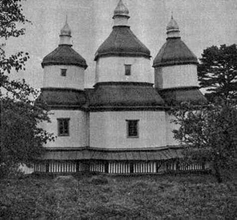 Деревянная, трехсрубная, трехглавая. Все срубы восьмигранные в плане, перекрыты барочными верхами с перехватом на высоких восьмериках с одним заломом. К бабинцу примыкает пристроенный позднее тамбур. Низко расположенное поддашие подчеркивает высокие пропорции срубов.