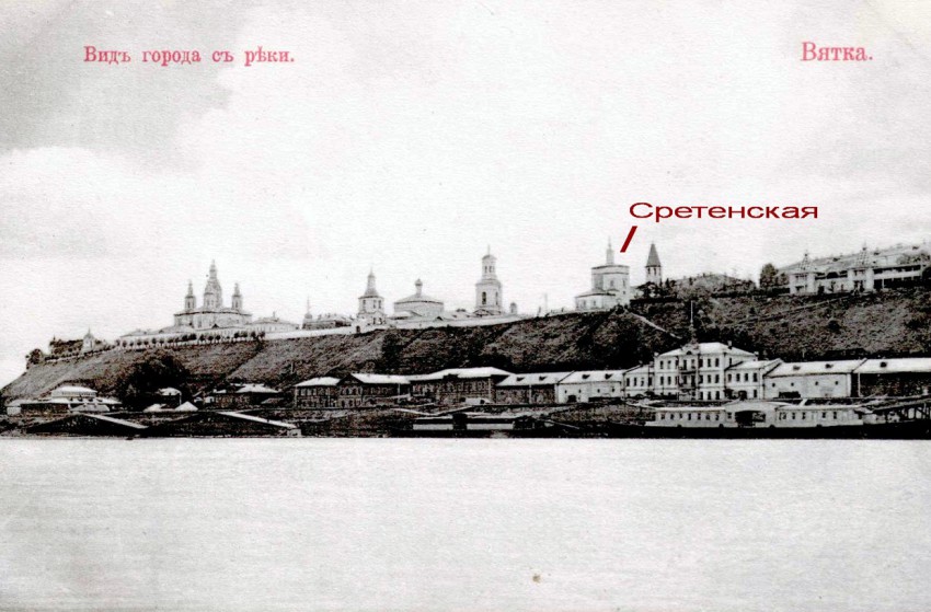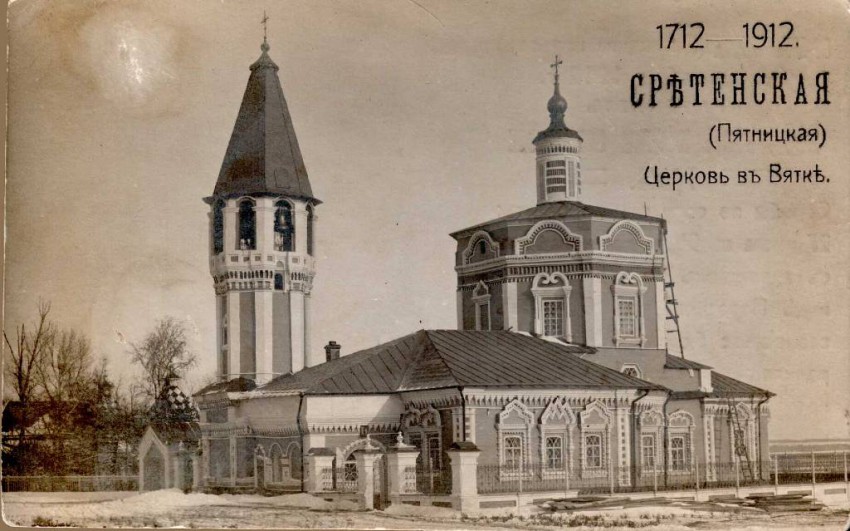 Каменная холодная Пятницкая церковь заложена по храмозданной грамоте архиепископа Дионисия «в большом городе у Слудских ворот на кладбище» вместо двух деревянных храмов: холодного и тёплого. Самое раннее упоминание о них содержится в духовном завещании хлыновца Ивана Шелома от 3 июля 1574 года. Сретенский (Пятницкий) храм назван памятником архитектуры ещё Императорской археологической комиссией. Единственный в Вятке храм с шатровой колокольней в 1924 году взят под охрану отделом по делам музеев Главнауки РСФСР. Тем не менее, 19 февраля 1935 года президиум Кировского горсовета ходатайствовал об исключении Сретенской церкви из списка памятников, охраняемых государством, как «не представляющей никакой ценности». В 1936 году памятник разобран на кирпич. Церковь в честь Сретения Господня – один из старейших каменных храмов г.Хлынова (Вятки). Была построена в 1705-1712 гг. на «Ветроуме» – высоком берегу реки Вятки, где впоследствии был разбит Александровский сад. Улица, ведущая к храму, получила название Пятницкой (Ст. Халтурина), так как один из престолов храма был посвящен мученице Параскеве Пятнице, жившей в III веке и почитаемой всеми православными людьми как покровительница полевых работ и животноводства.