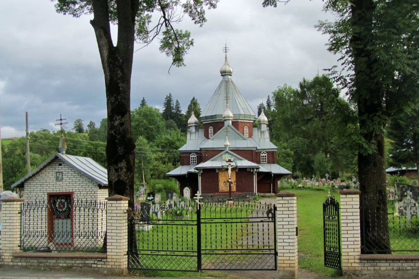 Построена в с. Яблонице (ныне Ивано-Франковской области) и перенесена на настоящее место — урочище Плитоватое — в 1871 г. Деревянная, пятисрубная, одноверхая, гуцульской школы. Срублена из еловых брусьев. Все крыши и стены выше поддашия покрыты гонтом. Крестовый план, близкий к равностороннему, образован пересечением прямоугольников. Западная и восточная ветви несколько длиннее северной и южной. Срубы всех ветвей перекрыты двускатными крышами с фронтонами и увенчаны маленькими шатровыми главками. В уровне карниза над спасанием квадратный сруб нефа переходит в восьмигранный барабан. Барабан перекрыт шатровой крышей с небольшим перехватом внизу и увенчан главкой, посаженной на небольшой восьмигранный фонарь. Вокруг устроено поддашие на выпусках венцов срубов. Имеет трое дверей. Центральный объем перекрыт шатровым срубом, боковые — плоскими перекрытиями. Балюстрада, хор и сруб восьмерика с шатром декорированы порезками. В интерьере памятника сохранились образцы декоративно-прикладной деревянной резьбы 1782-1785 гг. К юго-востоку от памятника расположена двухъярусная колокольня (восьмерик на четверике). Оба яруса срублены из еловых брусьев. В уровне первого яруса устроено круговое поддашие на выпусках венцов сруба, второй ярус покрыт шатровой крышей. Стены обоих ярусов открытые, кровли покрыты дранью. Прямоугольные прорези голосников закрываются задвижными ставнями. В 1971 г. церковь и колокольня реставрированы.(Памятники градостроительства и архитектуры Украинской ССР, цит. по http://ua.vlasenko.net)